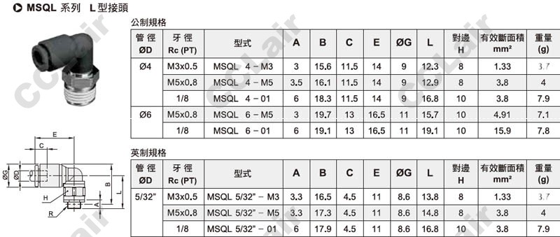 氣立可(chelic),MSQL4-M3,MSQL4-M5,MSQL4-01,MSQL6-M5,MSQL6-01,MSQL5/32-M3,MSQL5/32-M5,MSQL5/32-01,L型接頭