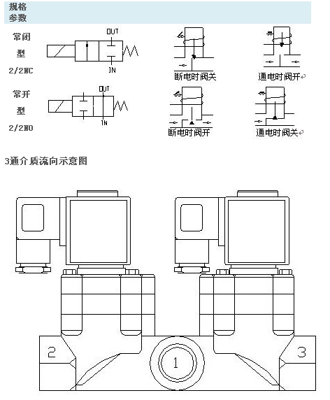 2:當(dāng)電磁閥線圈斷電時(shí),1與2關(guān)閉,1通向3。
