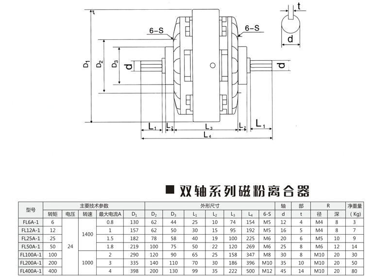 FL6A-1,FL12A-1,FL25A-1,FL50A-1,FL100A-1,FL200A-1,FL400A-1,雙軸磁粉離合器