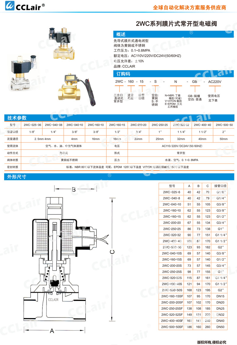 2WC025-06,2WC040-08,2WC160-15,2WC200-20S,ZWC250-25S,2WC320-32,2WC400-40S,2WC500-50SF,膜片式常開型電磁閥