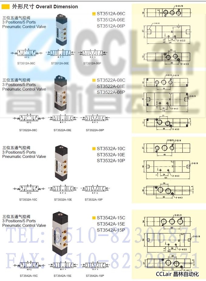 ST3522A-06C,ST3522A-08C,ST3532A-10C,ST3542A-15C,三位五通氣控閥