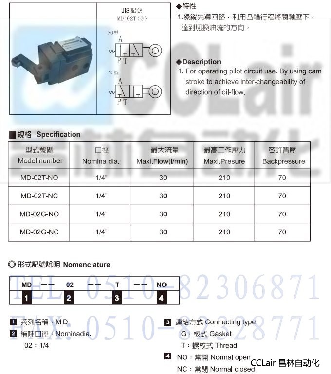 詳細(xì)信息 MD-02T-NO,MD-02T-NC,MD-02G-NO,MD-02G-NC,機(jī)械式換向閥