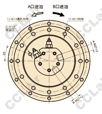 | 型 號(hào) | 扭矩N.m | 轉(zhuǎn)速范圍r/min | 傳動(dòng)比 | 壓力Mpa | 總排量 | 液壓馬達(dá) | 總重 | 適用機(jī)重ton | ||||