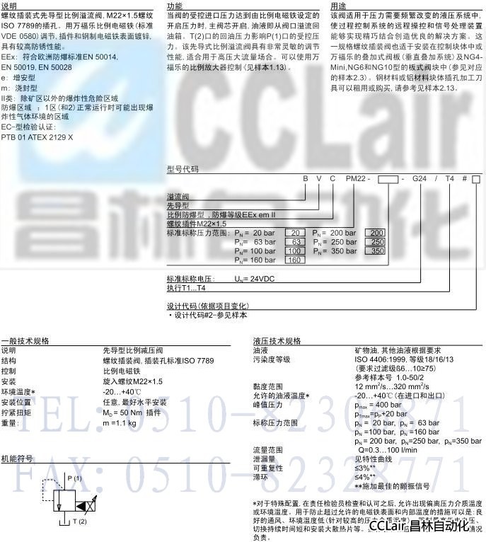 BVCPM22,BVCPM22-350,防爆型先導(dǎo)式比例壓力溢流插裝閥EEx em II