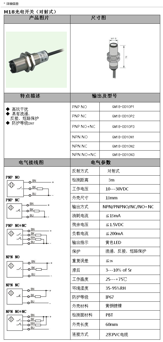 詳細(xì)信息 GM18-DD10P1,GM18-DD10P2,GM18-DD10P3,GM18-DD10N1,GM18-DD10N2,GM18-DD10N3,M18光電(對(duì)射)