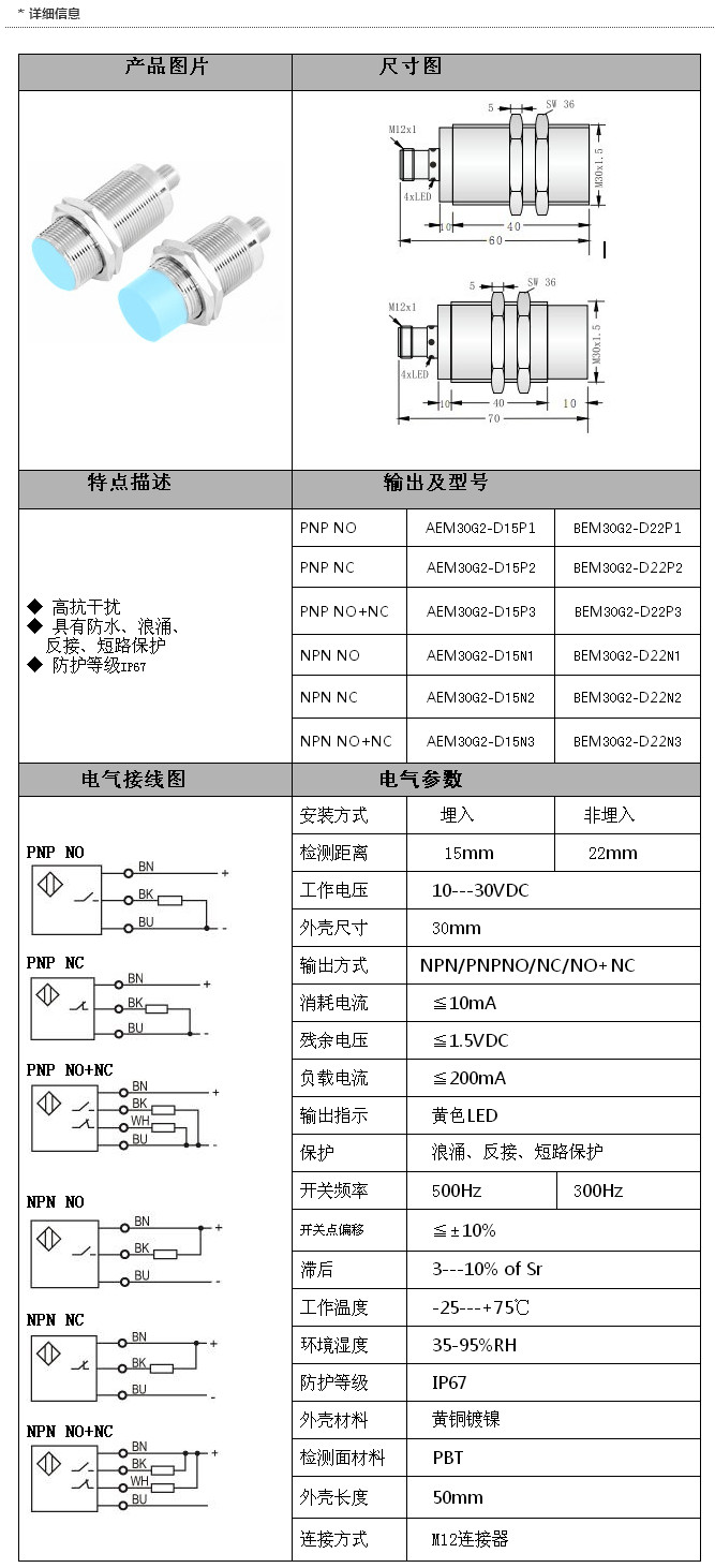 詳細(xì)信息 AEM30G2-D15P1,BEM30G2-D22P2,AEM30G2-D15N2,AEM30G2-D15N3,BEM30G2-D22N3,M30接插式接近開關(guān)