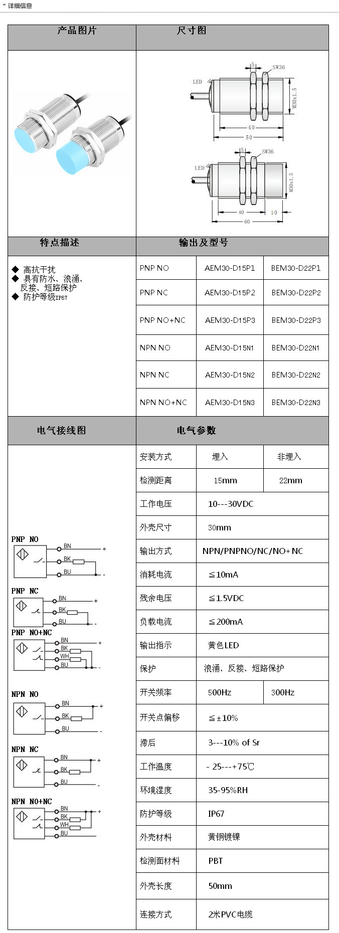 詳細(xì)信息 AEM30-D15P1,BEM30-D22P1,AEM30-D15P2,BEM30-D22P2,AEM30-D15N3,M30長距離接近開關(guān)