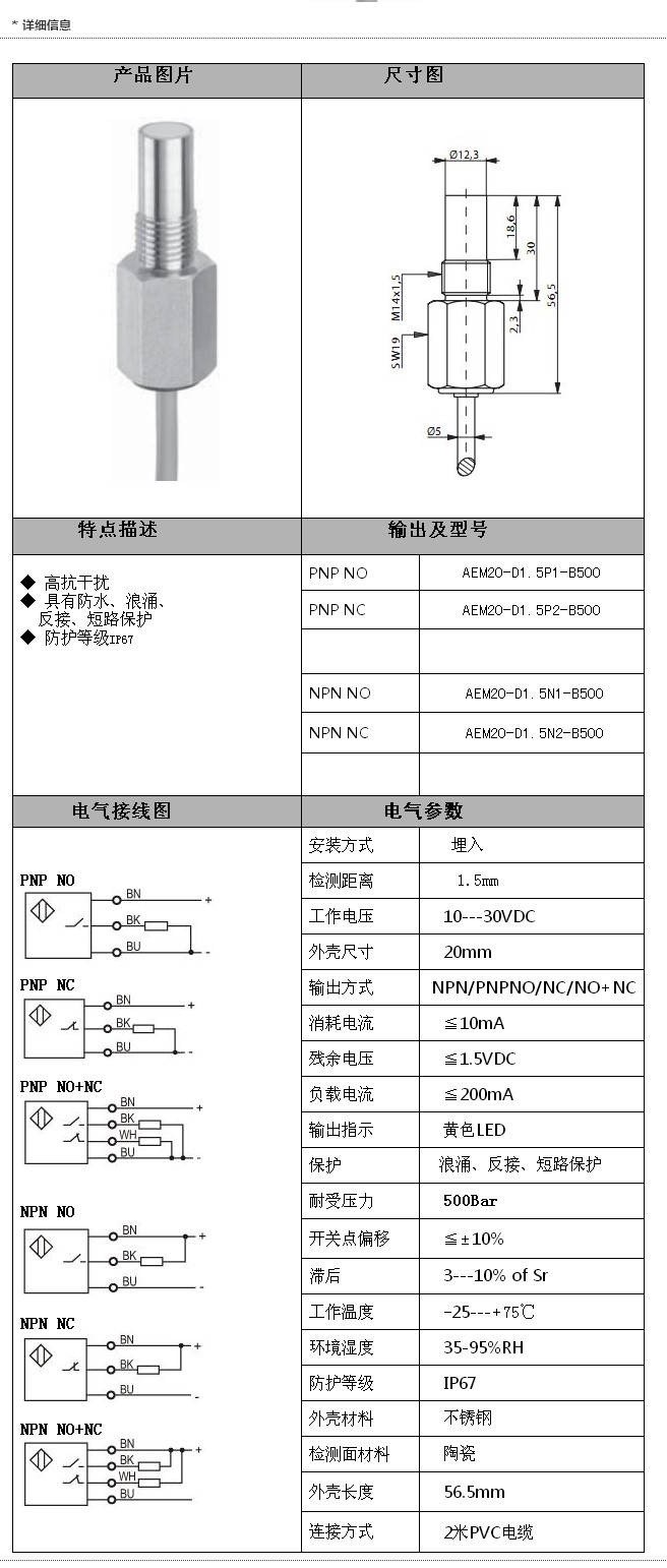 詳細信息 AEM20-D1.5P1-B500,AEM20-D1.5P2-B500,AEM20-D1.5N1-B500,AEM20-D1.5N2-B500,M20耐高壓傳感器