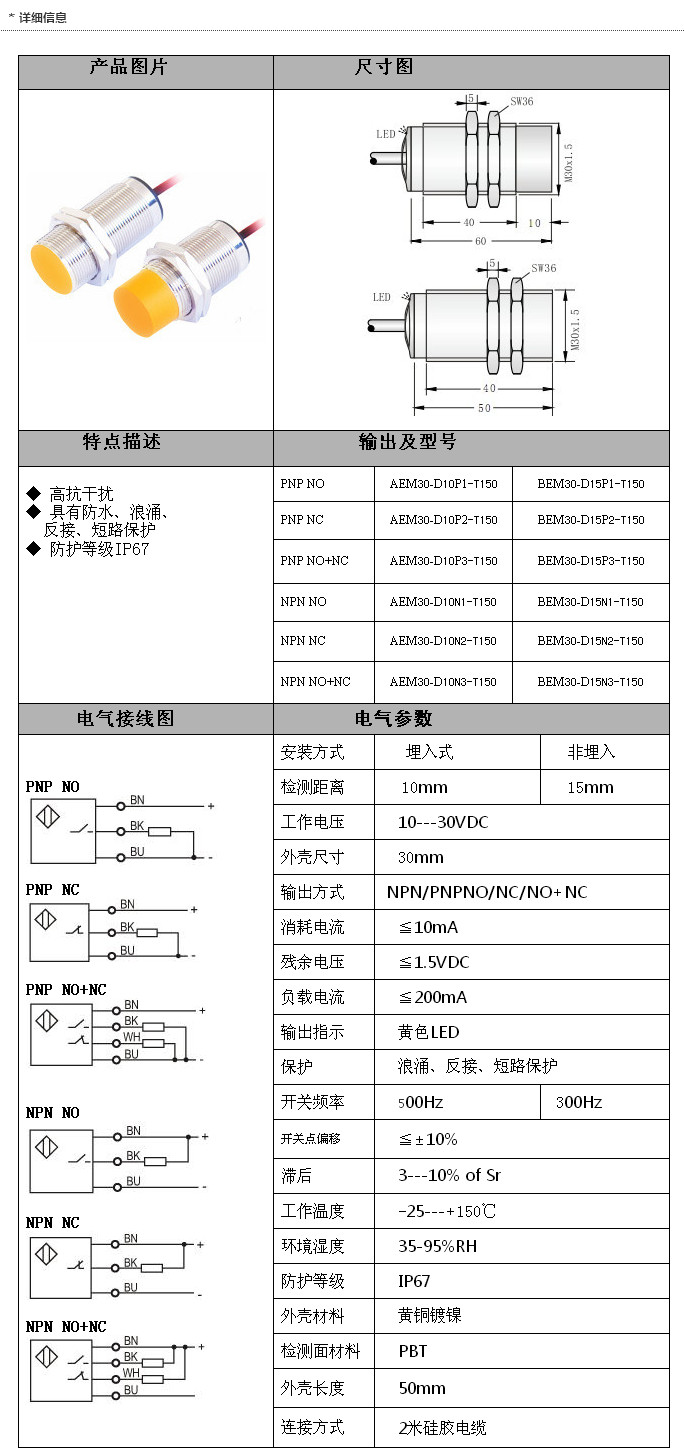 詳細信息 AEM30-D10P1-T150,AEM30-D10P2-T150,AEM30-D10N2-T150,BEM30-D15N2-T150,耐高溫M30接近開關