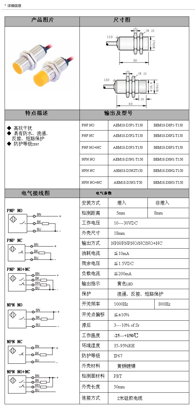 詳細(xì)信息 AEM18-D5P1-T150,BEM18-D8P1-T150,AEM18-D5N2-T150,BEM18-D8N3-T150,耐高溫M18接近開關(guān)