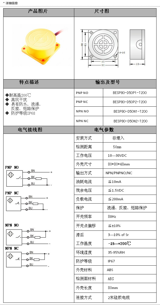 詳細(xì)信息 BESP80-D50P1-T200,BESP80-D50P2-T200,BESP80-D50N1-T200,BESP80-D50N2-T200,SP80耐高溫200℃接近開關(guān)