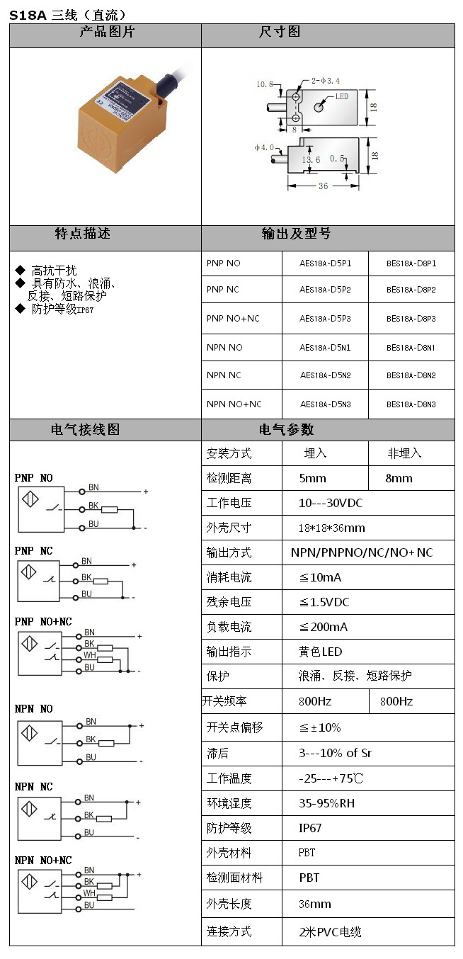 AES18A-D5P1,BES18A-D8P1,AES18A-D5P2,AES18A-D5N2,AES18A-D5N3,BES18A-D8N3,S18A直流三線接近開關(guān)