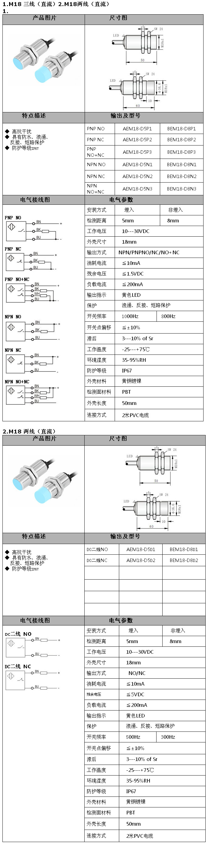 AEM18-D5P1,AEM18-D5P2,BEM18-D8N2,BEM18-D8N3,BEM18-D8D1,BEM18-D8D2,M18直流三二線接近開(kāi)關(guān)