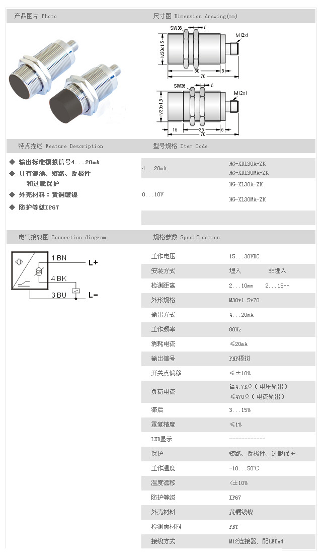 詳細(xì)信息 電感式線性傳感器 HG-XDL30A-ZK,HG-XDL30MA-ZK,HG-XL30A-ZK,HG-XL30MA-ZK,