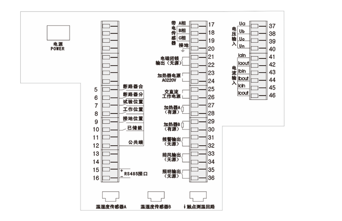 該產品功能強大,有帶電顯示,溫濕度數字顯示,三相觸頭溫度值顯示,自動加熱除濕控制,斷路器分合閘狀態(tài)指示,儲能、接地開關指示,手車位置指示,一次回路模擬圖,二次回路電壓數值顯示,人體感應柜內照明,智能語音防誤提示,語音帶電提示,分合閘回路指示,電壓、電流、有功功率、無功功率、功率因數、頻率測量以及RS485通訊接口等功能。