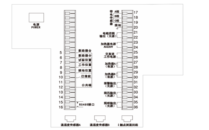 該產品功能強大,有帶電顯示,溫濕度數(shù)字顯示,三相觸頭溫度值顯示,自動加熱除濕控制,斷路器分合閘狀態(tài)指示,儲能、接地開關指示,手車位置指示,一次回路模擬圖,二次回路電壓數(shù)值顯示,人體感應柜內照明,智能語音防誤提示,語音帶電提示,分合閘回路指示,電壓、電流、有功功率、無功功率、功率因數(shù)、頻率測量以及RS485通訊接口等功能。