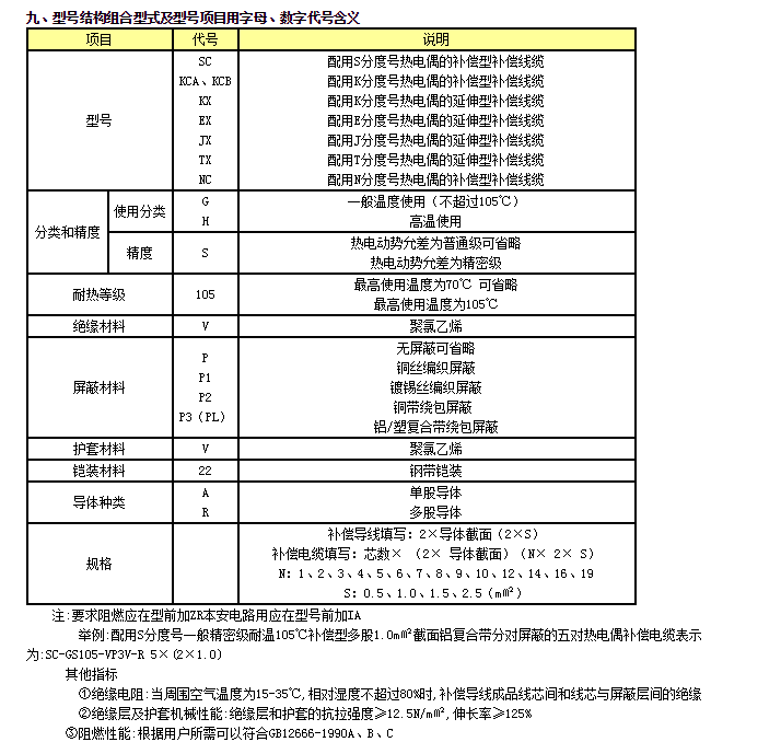 注:1、其它型號(hào)補(bǔ)償導(dǎo)線如:KC、JX、SC、EX、NC、TX等,只需改寫(xiě)型號(hào)的第一項(xiàng),如:EX-G-VV、TX-H-FVP等;