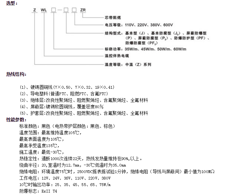 ZWL(ZXW/ZBR/ZKW/ZBW/ZWK/ZHR/DZ/HV/ZKWZ)中溫溫控伴熱電纜相對應國外型號瑞侃QTVR和賽盟RBX系列
