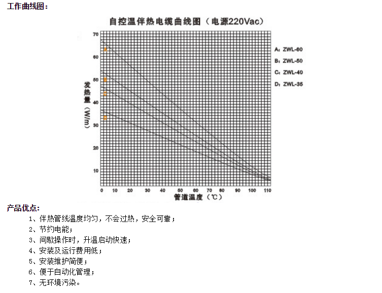⒉低溫狀態(tài)速起動,溫度均勻,因每一局部皆可因其被伴熱處的溫度變化自動調(diào)節(jié);