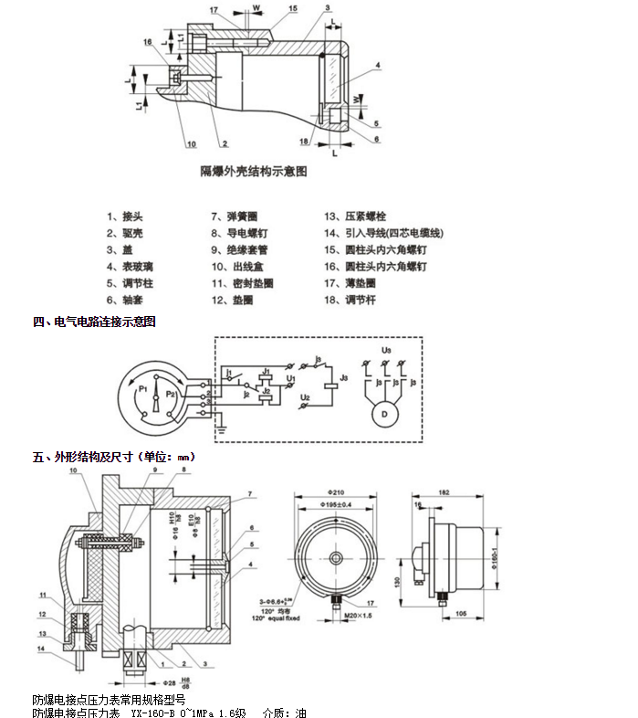 防爆電接點壓力表系按GB3836.183《爆炸性環(huán)境用防爆電氣設(shè)備通用要求》和GB3836.28爆炸性環(huán)境用防爆電氣設(shè)備 隔爆型電氣設(shè)備“d”》的有關(guān)規(guī)定相關(guān)標(biāo)準(zhǔn)進行設(shè)計,并經(jīng)由國家指定的檢驗機構(gòu)所審批的圖樣和技術(shù)文件進行制造。