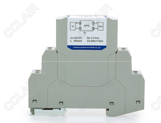 24VDC電源SPD,適合24VDC、電磁閥等電源回路,最大放電電流Imax(8/20us):20kA/線,12.5mm超薄,通過DIN35金屬導(dǎo)軌接地。