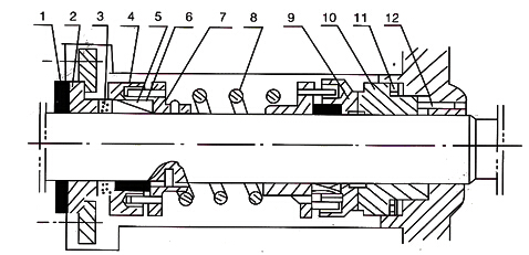 雙機械密封裝置主要由墊圈(1)內(nèi)靜環(huán)(2)動環(huán)(3)動環(huán)體(4)密封圈(5)(6)推環(huán)(7)彈簧(8)動環(huán)(9)外靜環(huán)(10)靜環(huán)密封圈(11)防轉(zhuǎn)銷(12)等主要零件組成。