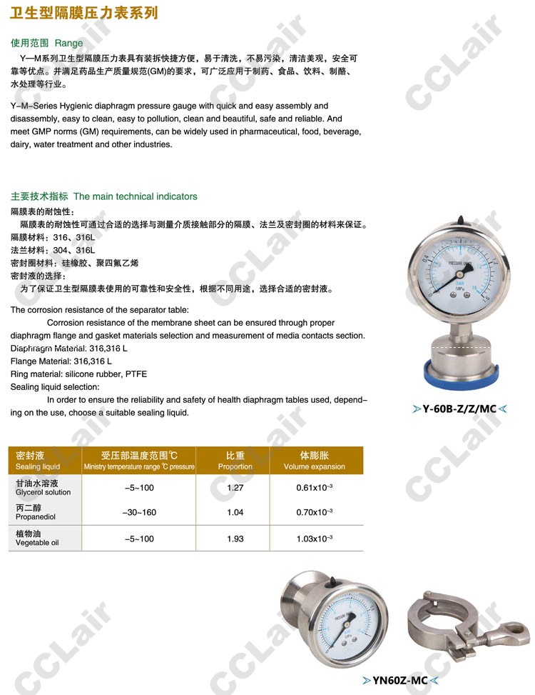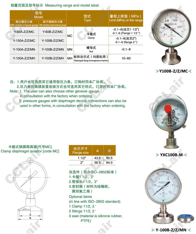 Y-60A-Z/ZMC,Y-100A-Z/ZMC,Y-100A-Z/ZMN,Y-100A-Z/ZMH,衛(wèi)生型隔膜壓力表,無錫昌林