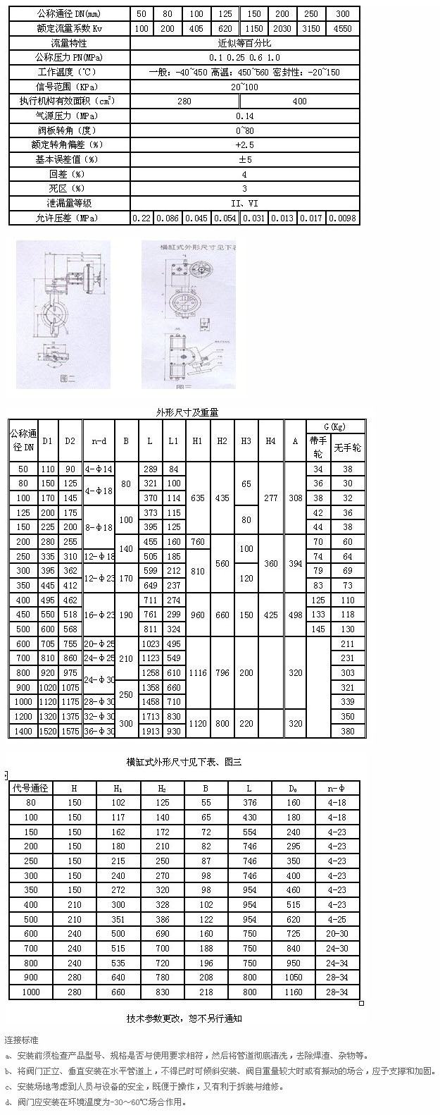 本系列產(chǎn)品有標(biāo)準(zhǔn)型、高溫型及密封型三種。產(chǎn)品公稱(chēng)壓力等級(jí)有0.1、0.25、0.6、1.0MPa,口徑由50mm至1400mm,泄漏量等級(jí)有II級(jí)和VI級(jí),流量特性為近似等百分比。