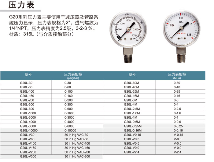 G20L-60M,G20L-40M,G20L-25M,G20L-16M,G20L-6M,G20L-4M,G20L-2.5M,G20L-1.6M,G20L-1M,G20L-0.6M,壓力表
