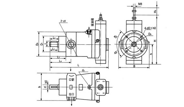 表示:排量為63毫升/轉,壓力為31.5MPa的手動變量的缸體旋轉的軸向柱塞油泵。