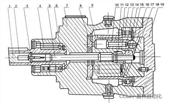 馬達外軸(3)同軸承(4)、(6)支承在殼體(7)上,內(nèi)軸(5)通過花鍵一端與外軸聯(lián)接,另一端與缸體(9)花鍵聯(lián)接,啟動及空載時缸體在彈簧(2)和(11)作用下與配油盤(8)保持一定的油膜接觸,缸體另一端用軸承(13)支承在殼體上,缸體孔中有七個柱塞(10),柱塞的球形端部與滑靴(17)球窩包鎖,通常在工作時滑靴受油液壓力作用與斜盤(18)保持一定的油膜接觸,但當(dāng)自吸啟動和轉(zhuǎn)速突然升高時,油靴可能浮起,為了防止這種現(xiàn)象,在內(nèi)軸端部受彈簧(11)作用的球鉸(15)頂住回盤將滑靴壓在斜盤表面。