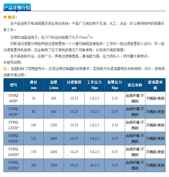 詳細(xì)信息 SYGQ-400x50,SYGQ-800x80,SYGQ-1200x100,SYGQ-1600x125,SYGQ-2400x150,SYGQ-3200x200,雙聯(lián)油過濾器