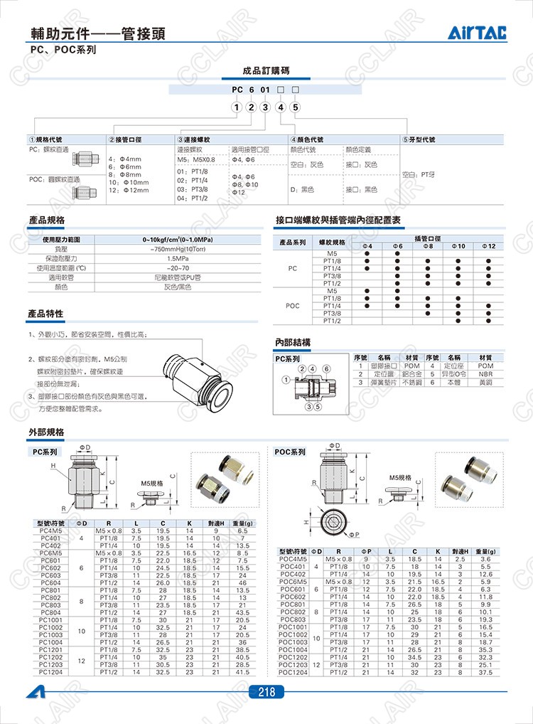 AIRTAC亞德客 管接頭PC4M5,PC401,PC402,PC6M5,PC601,PC602,PC603,PC604,PC801,PC802,PC803,PC804 PC1001,PC1002,PC1003,PC1004,PC1201,PC1202,PC103,PC1204 POC4M5,POC401,POC402,POC6M5,POC601,POC602,POC801,POC802,POC803,POC1001 POC1002,POC1003,POC1004,POC1202