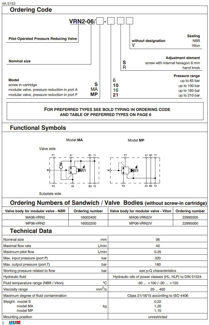 VRN2-06/S-10S 15997200,VRN2-06/S-21S 15997500,VRN2-06/MP-10S 15998400,VRN2-06/MP-21S 15999000,ARGO先導(dǎo)式減壓閥