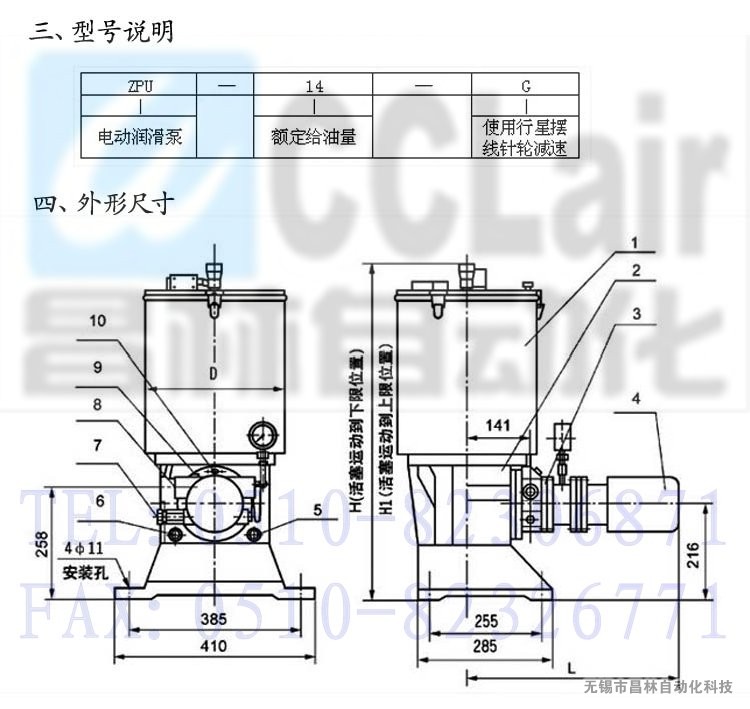 | 1、貯油筒;2、泵座;3、帶連結(jié)法蘭的柱塞泵裝置;4、減速電機5、加油口G3/4; 6、回油口G3/4;7、調(diào)壓安全閥;8、出油口G3/4;9、過濾器;10、單向閥 |