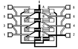 潤滑劑以箭頭方向進入分配器壓送到活塞A的右側(cè)末端?;钊鸄通過潤滑劑壓力而向左側(cè)運動。位于活塞A左側(cè)前端的潤滑劑通過殼體內(nèi)部通道輸送到排出口2 并從此通過潤滑位置管道到達摩擦位置。