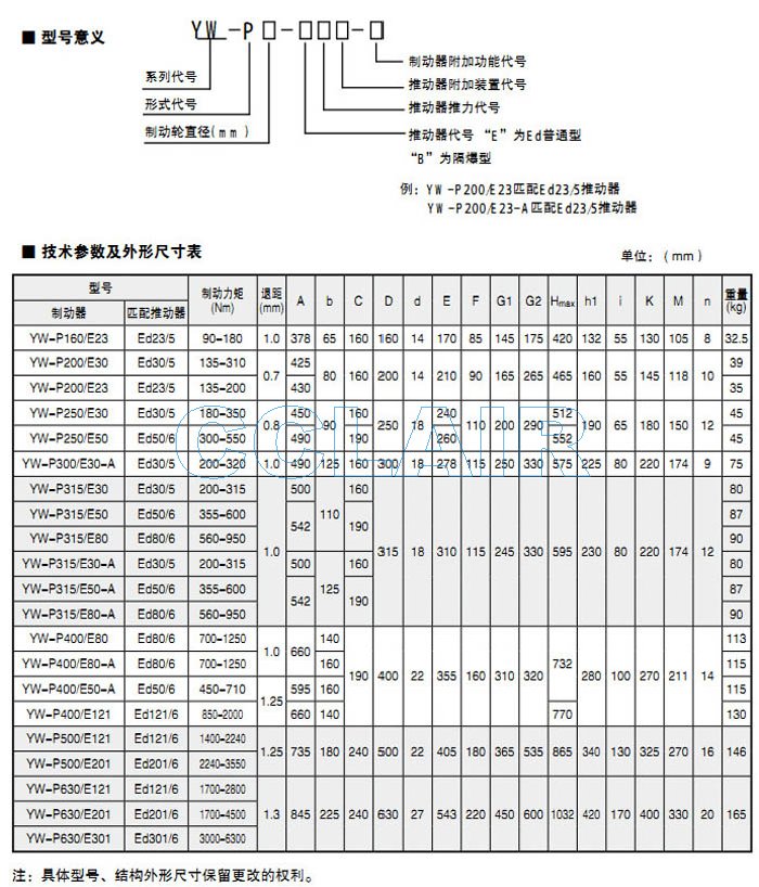 YW-P250/E30,YW-P250/E50,YW-P300/E30-A,YW-P315/E30,YW-P315/E50,電力液壓鼓式制動器