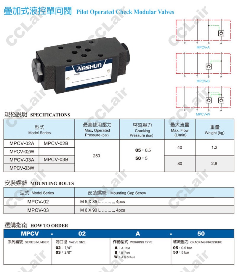 MPCV-02A,MPCV-02B,MPCV-02W,MPCV-03A,MPCV-03B,MPCV-03W,MPCV-02W-50,ASHUN油順疊加式液控單向閥