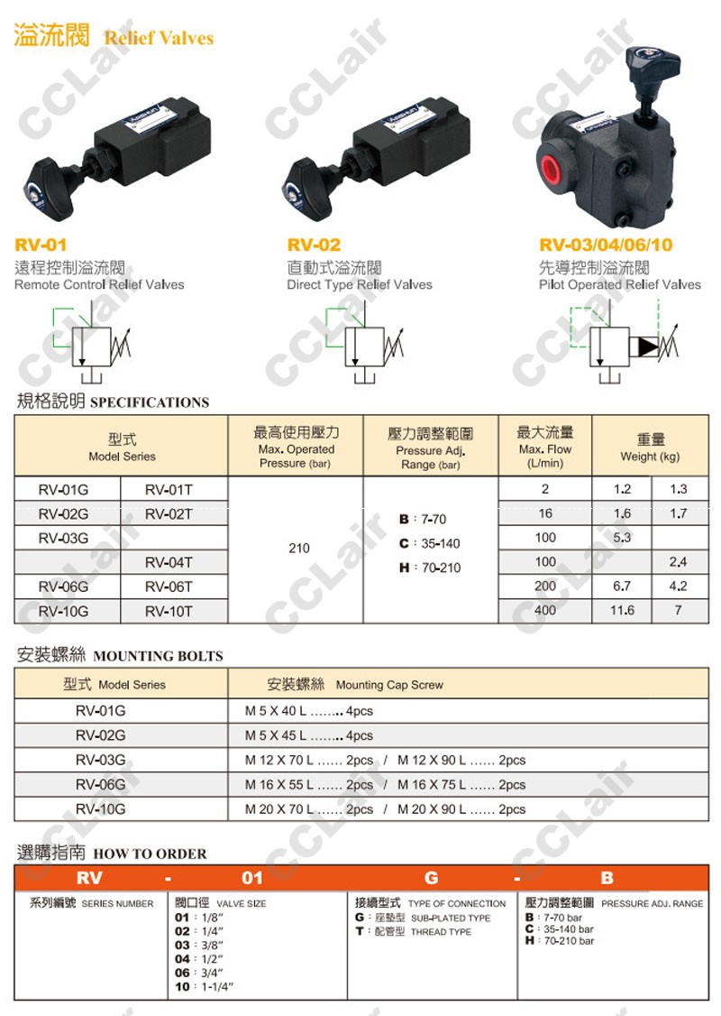 RV-01G,RV-01T,RV-02G,RV-02T,RV-03G,RV-04T,RV-06G,RV-06T,RV-10G,RV-10T,ASHUN油順溢流閥