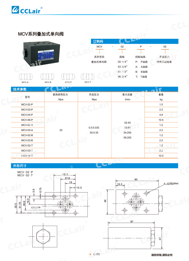 疊加式液壓單向閥MC-02A,MC-02B,MC-02P,MC-02T,MC-03A,MC-03B,MC-03P,MC-03T,
