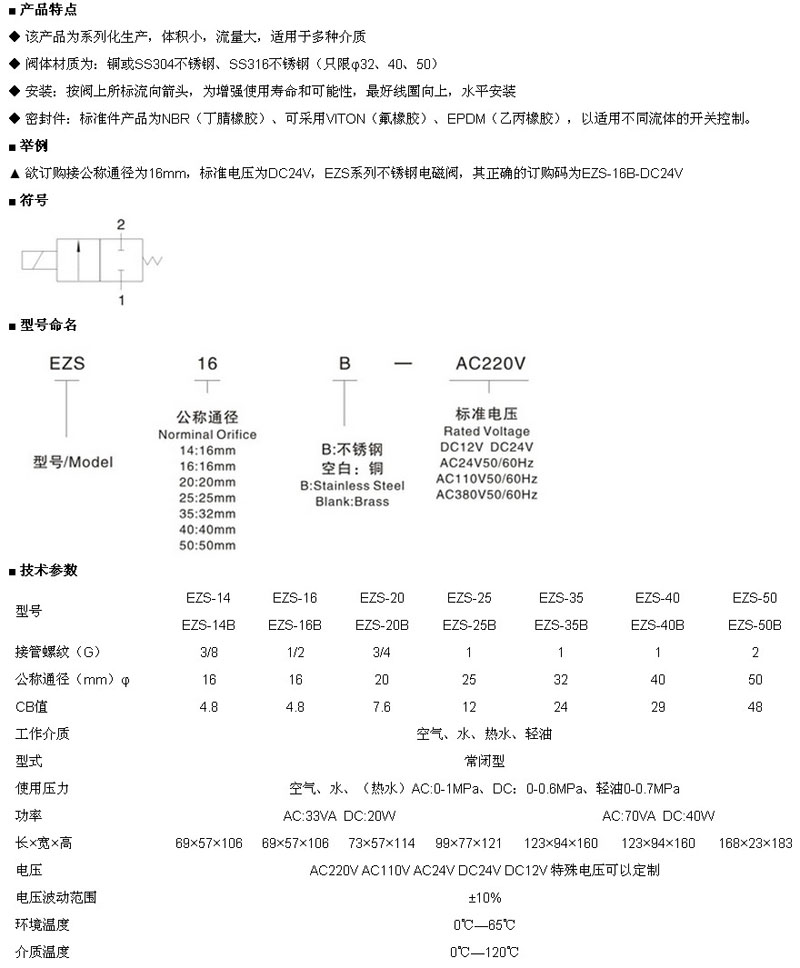 詳細(xì)信息 EZS-14,EZS-16B,EZS-20,EZS-25B,EZS-35,EZS-40,EZS-50,二位二通直動(dòng)式電磁閥