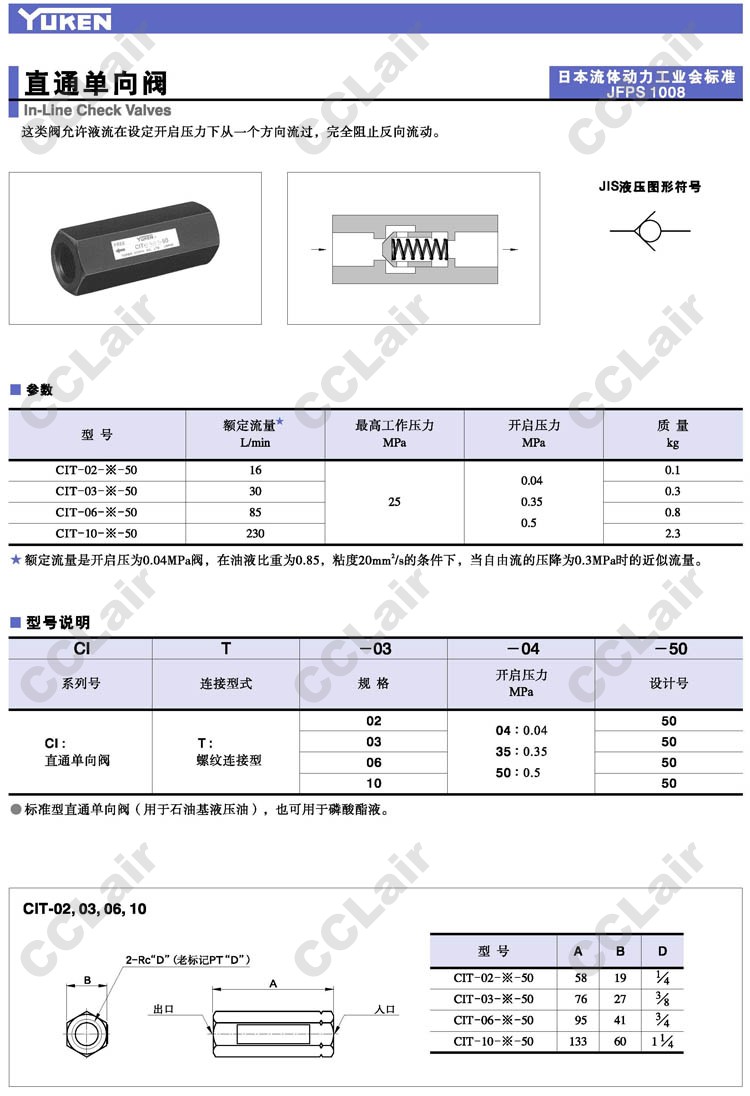 CIT-02,CIT-03,CIT-06,CIT-10,CIT-02-04-50,CIT-03-04-50,CIT-06-04-50,CIT-10-04-50,YUKEN,直通單向閥