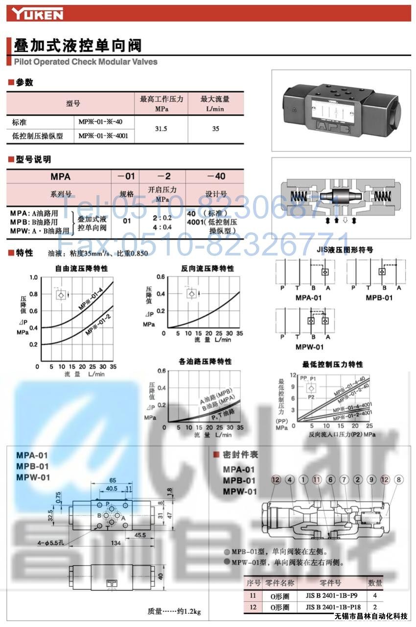 MPA-01-2-40,MPA-01-2-4001,MPA-01-4-40,MPA-01-4-4001,疊加式液控單向閥,榆次油研YUKEN疊加式液控單向閥