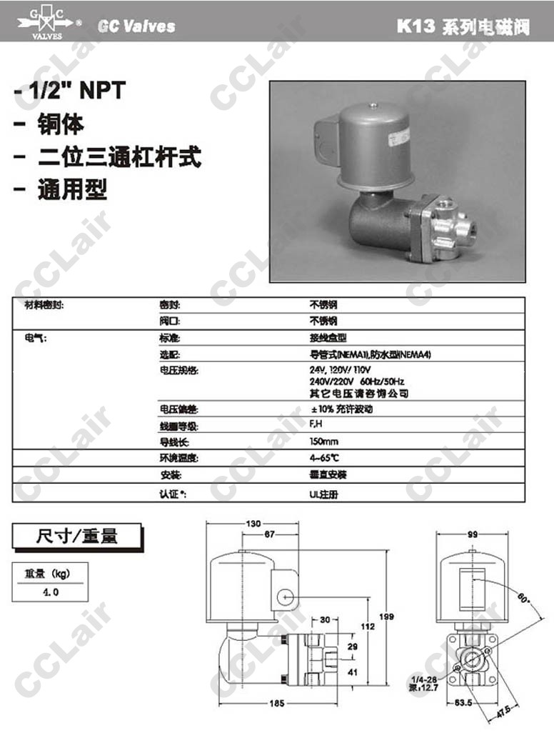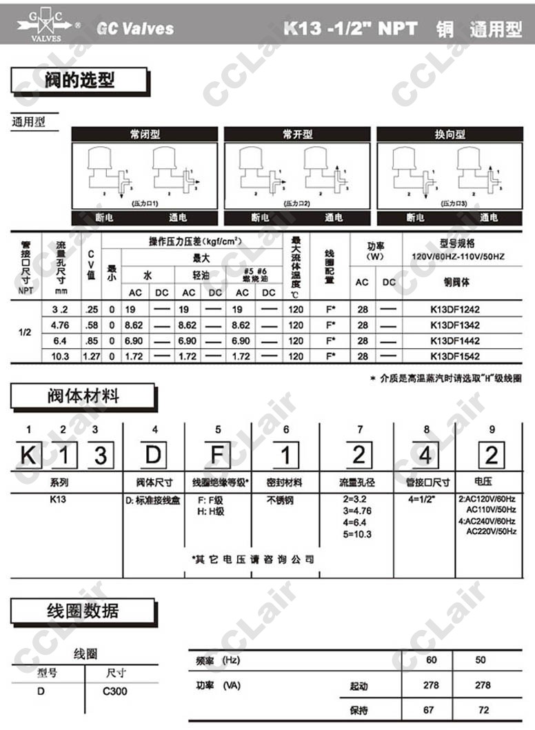 詳細(xì)信息 K13DF1242,K13DF1342,K13DF1442,K13DF1542,GC Valves二位三通杠桿式電磁閥