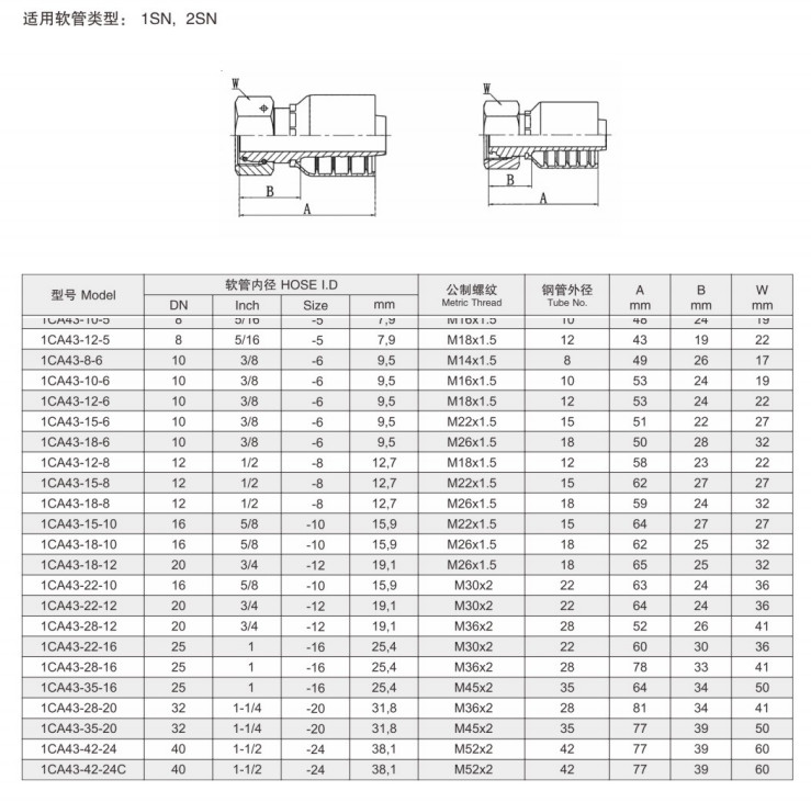 瀏覽次數(shù):7351CA43-6-4,1CA43-8-4,1CA43-10-4,1CA43-12-4,1CA43-8-5,1CA43-0-5,扣壓式軟管接頭 |