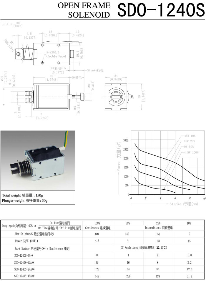 SDO-1240S-6A,SDO-1240S-12A,SDO-1240S-24A,SDO-1240S-48A,直動電磁鐵