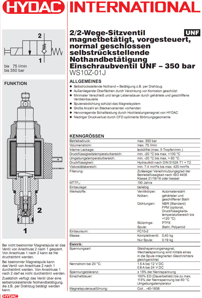 WS10Z-01J-C-N-24DG,WS10Z-01J-C-N-12DG,HYDAC電磁2/2方向座閥