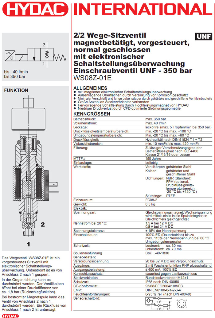 WS08Z-01E-C-N-12DG,WS08Z-01E-C-N-24DG,WS08Z-01E-C-N-230AG,HYDAC電磁2/2方向座閥