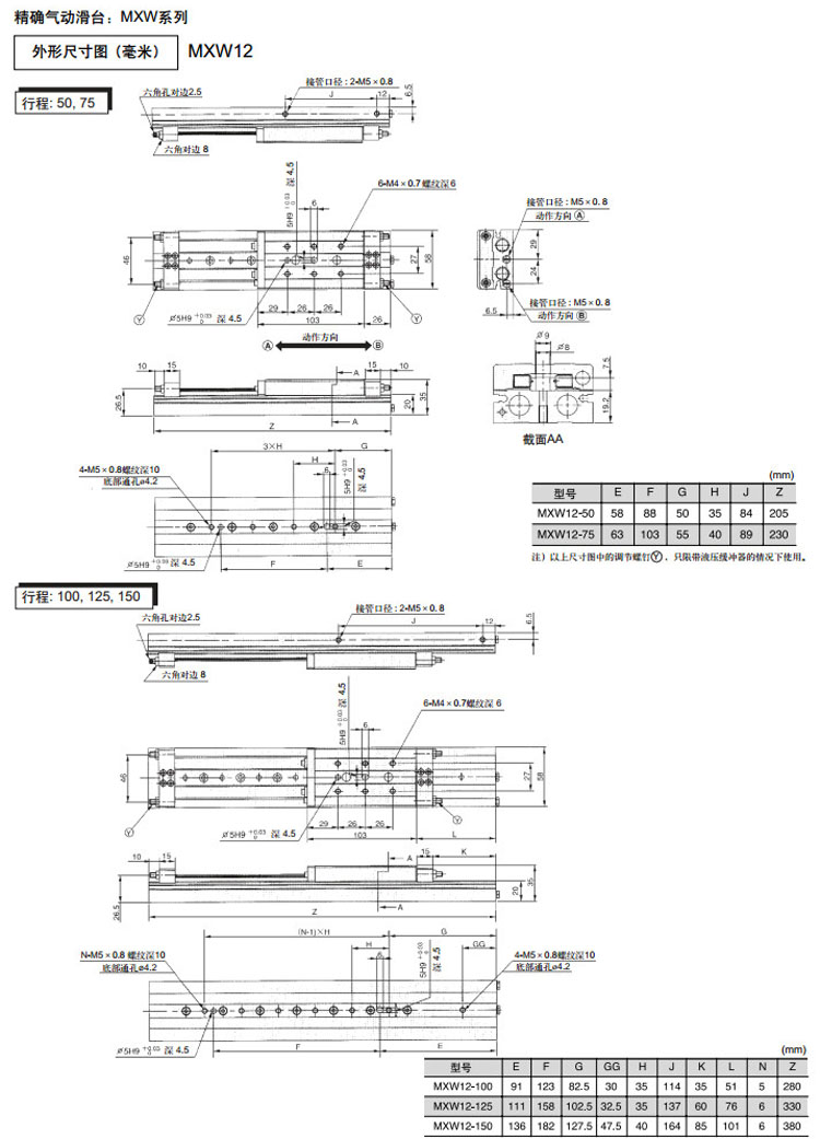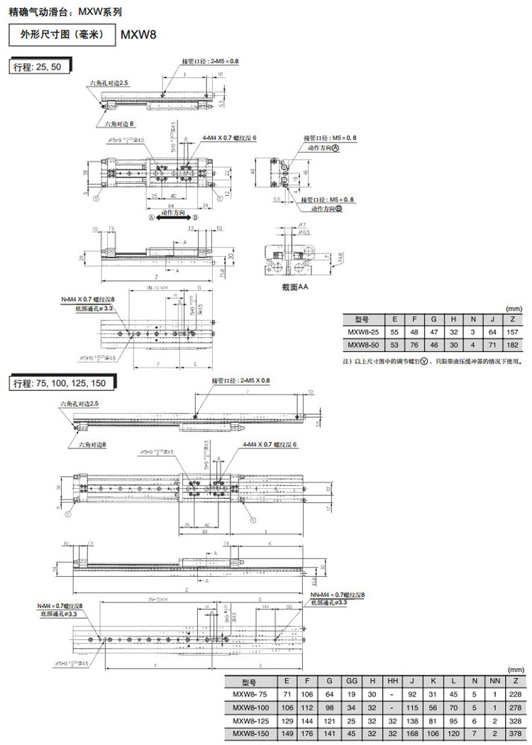 MXW8-25,MXW12-50,MXW16-75,MXW20-100,MXW25-100,MXW8-50,MXW12-75,MXW16-100,SMC氣動滑臺氣缸