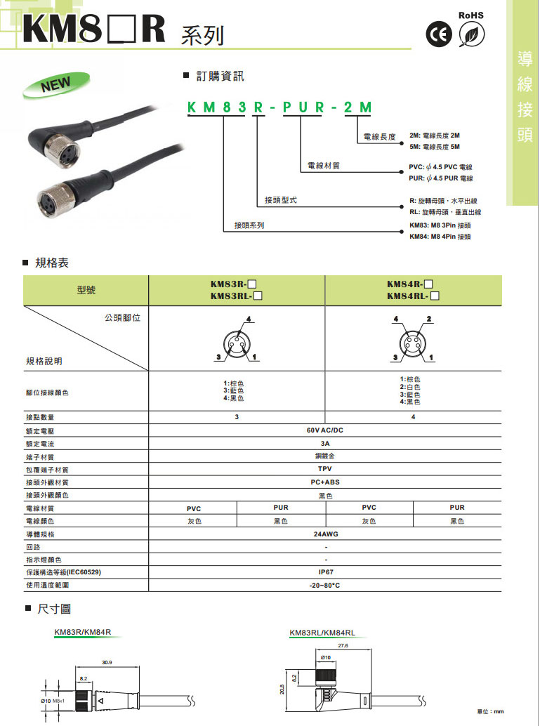 KM83R-PUR-2M,KM83R-PUR-5M,KM83R-PVC-2M,KM83R-PVC-5M,KM83RL-PUR-2M,KM83RL-PUR-5M,